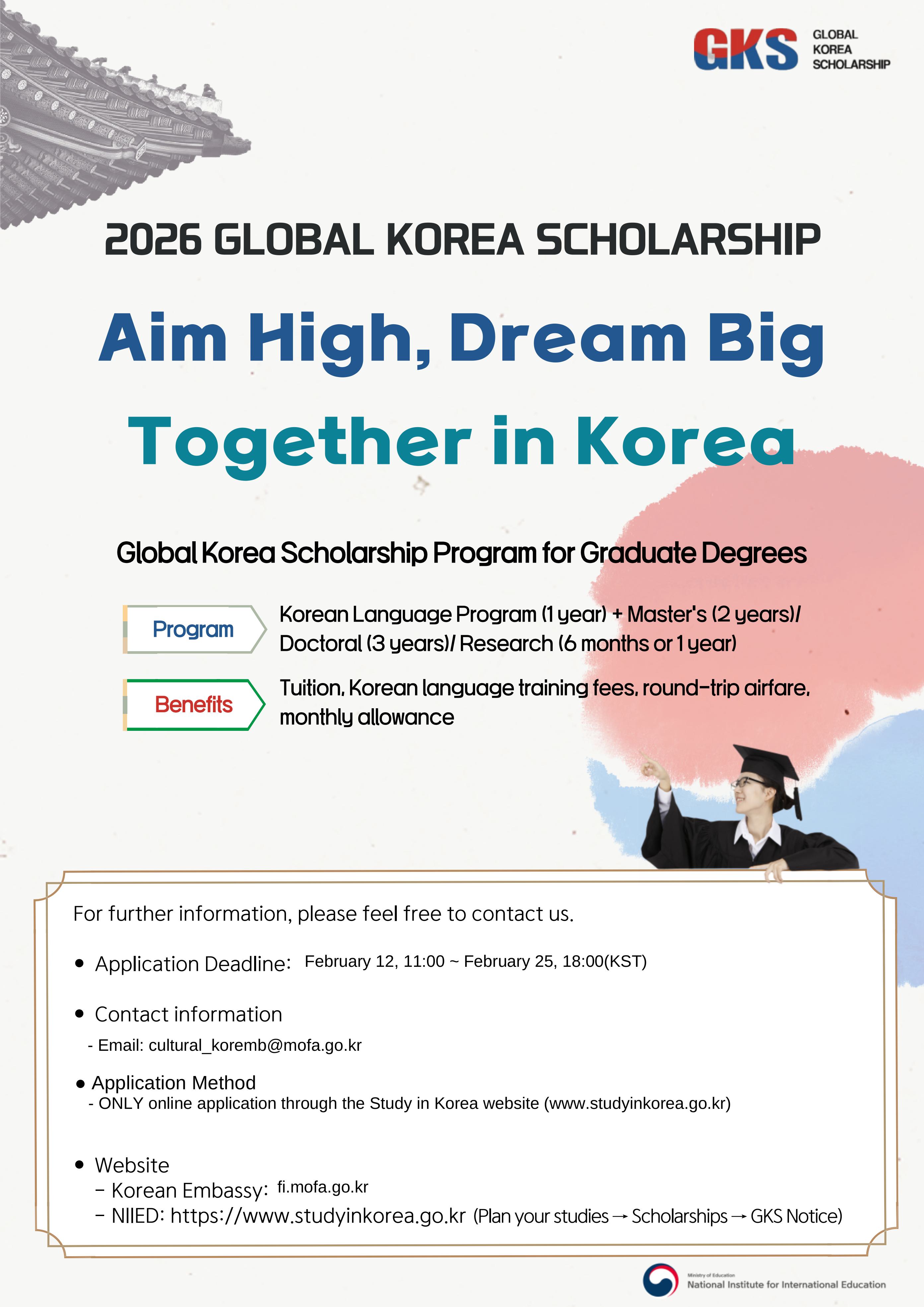 Further information about the 2026 Graduate GKS is available at the websites https://www.niied.go.kr/web/NIIED/contents/niiedEng/eng_gksDegree or https://www.studyinkorea.go.kr/ko/plan/scholarship.do